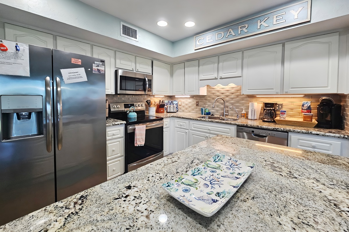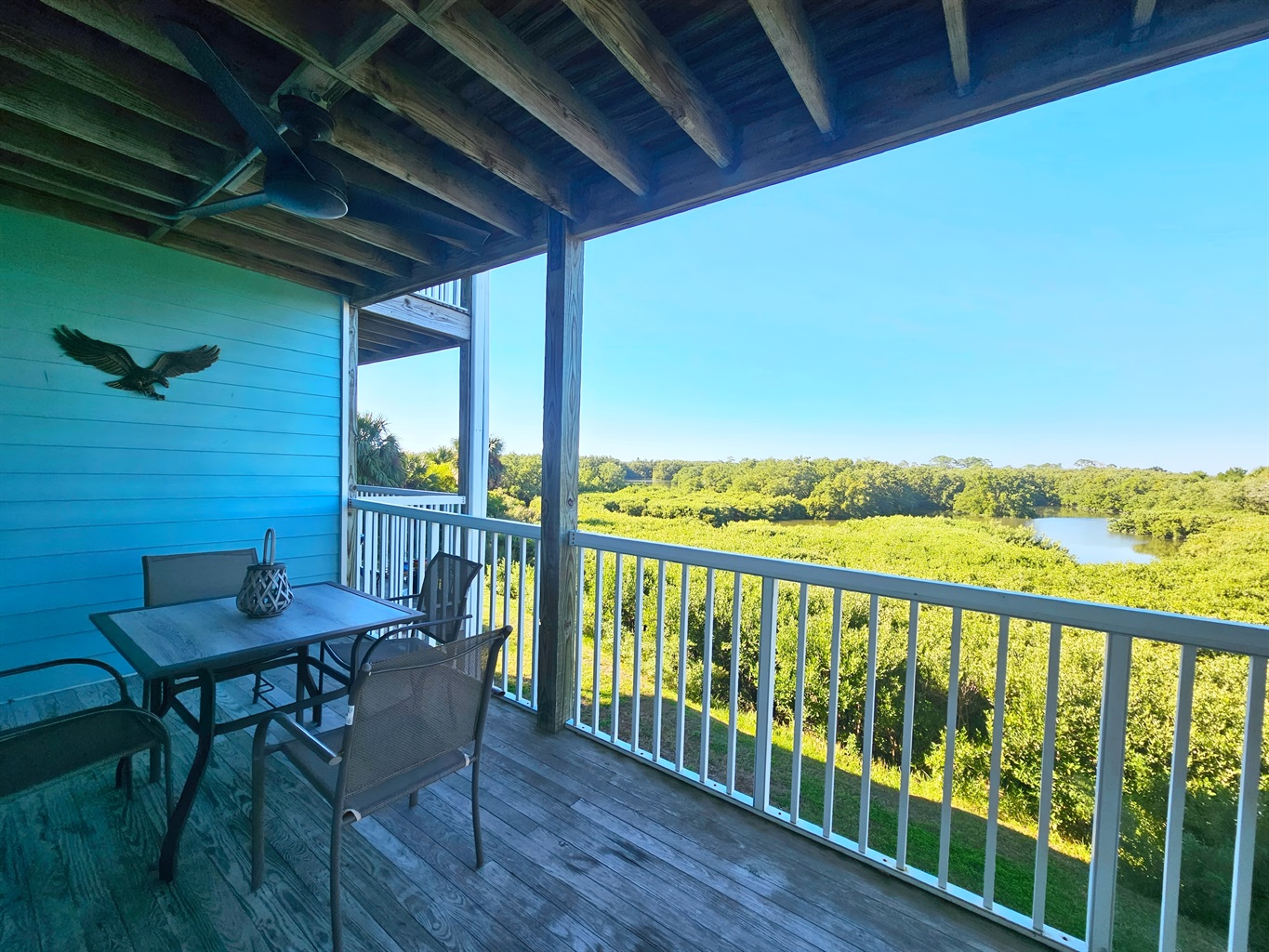 2 Bedrooms • 2 Bathrooms 2 Baths • Sleeps 4-6All newly furnished condo with designer decor! Beachy vibe with class invites you to downshift from every day life while enjoying beautiful surroundings. From the gorgeous rugs to the pewter leather rocker recliner to the locally sourced art throughout, you will see immediately this is no average condo. Fully furnished kitchen with new appliances, new dishes, and spotless cleaning will allow you to cook in for every meal you desire. Quality mattresses and high end linens throughout will have you sleeping like a baby! Every amenity has been planned for your best stay. If you’re staying in for the night, you’ll love the overstuffed couch and loveseat combo for plenty of seating for the entire group. Big screen TV with sound bar give you theater style in a private setting. Both bedrooms have TVs and DVD players for maximum entertainment for everyone. You won’t want to leave the balcony porch! Rocking chairs, ceiling fan and plenty of dining seating are set for you to take in the view all day long. Don’t worry, if you decide to view at night, small lanterns keep your visibility high and distractions low. Bird watcher’s take note: this is one of the finest places to view roseate spoonbills roosting in the mangroves! Osprey, Eagles, skimmers and more abound. Heated pool (seasonally) is perfect after a long day on the water. Community golf cart charging station to recharge from gallivanting around town—it’s one of the best ways to see the island! Kayak rack for the outdoor enthusiast is directly below this unit. Go ahead and book this one before it gets away. This is the premier condo in the area! Welcome to “Paradise in the Mangroves”!