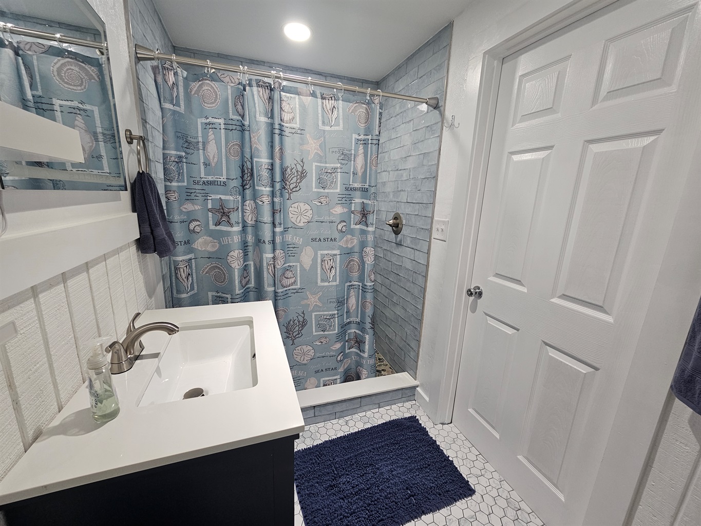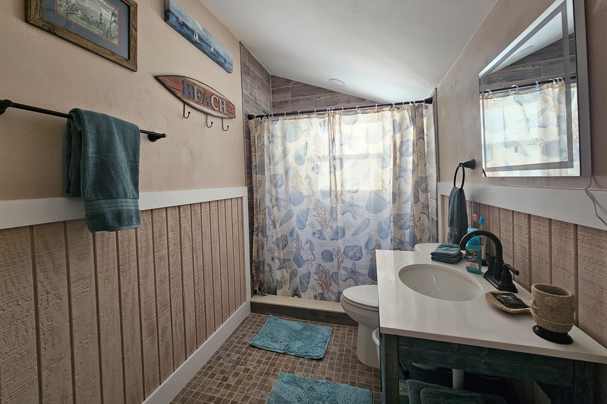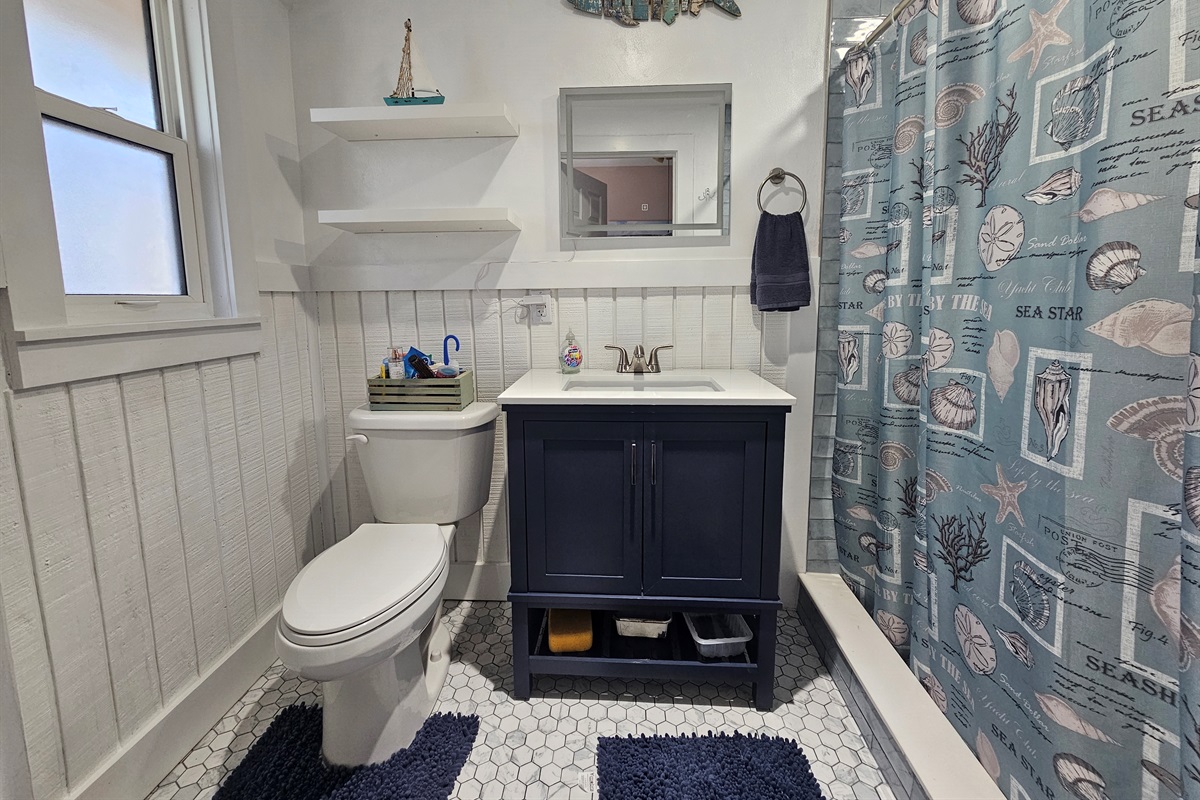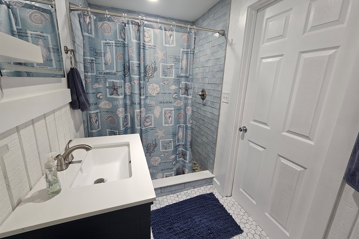 Modern Amenities: The updated bathroom offers a crisp, clean aesthetic with a stylish vanity and a subway-tiled walk-in shower.