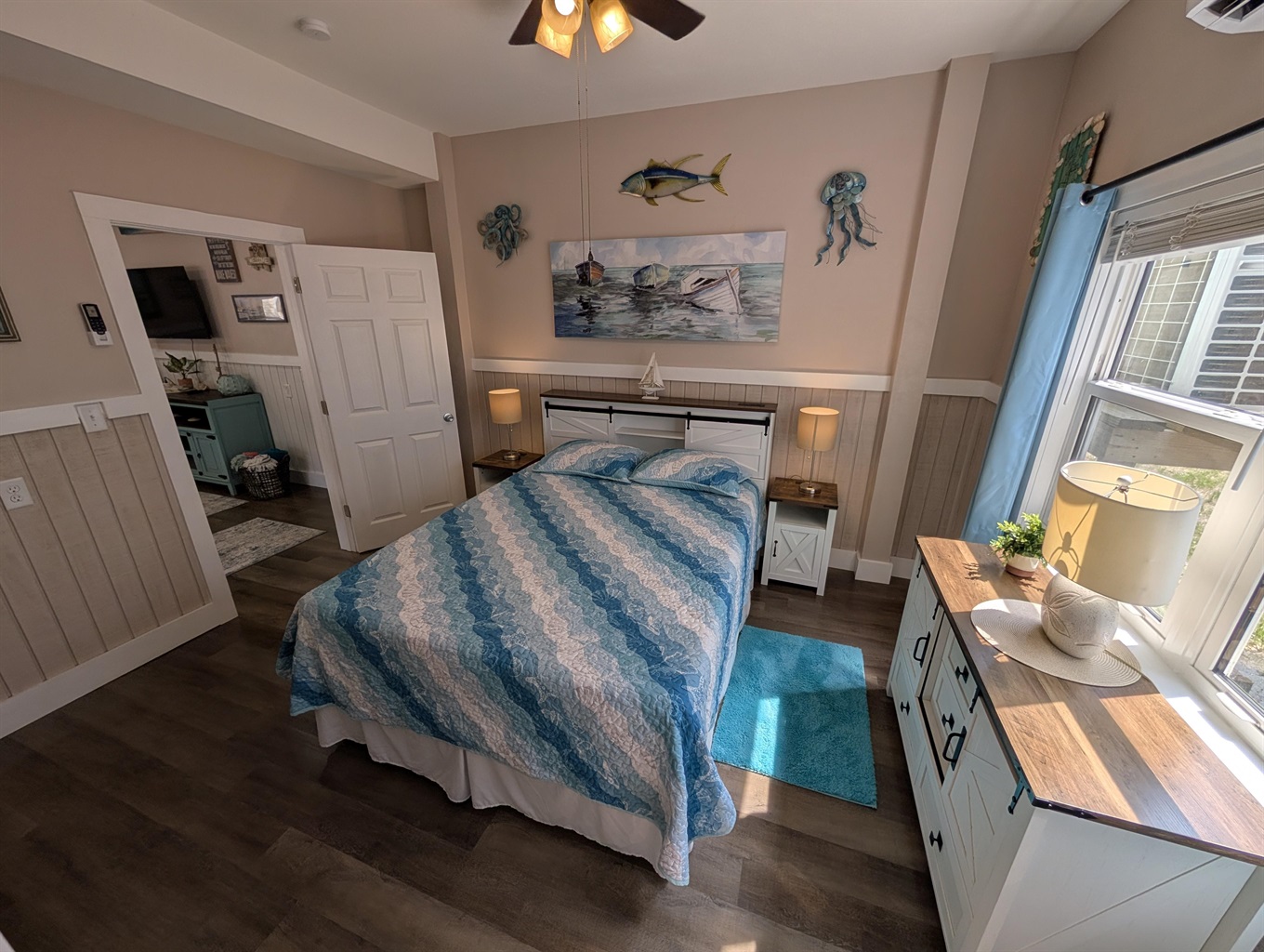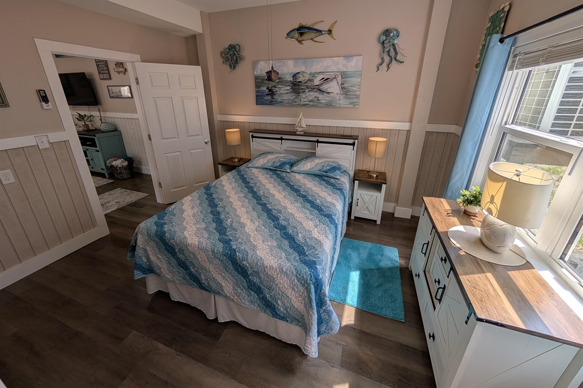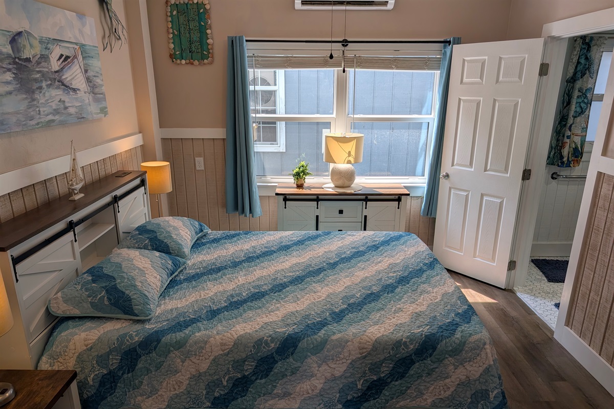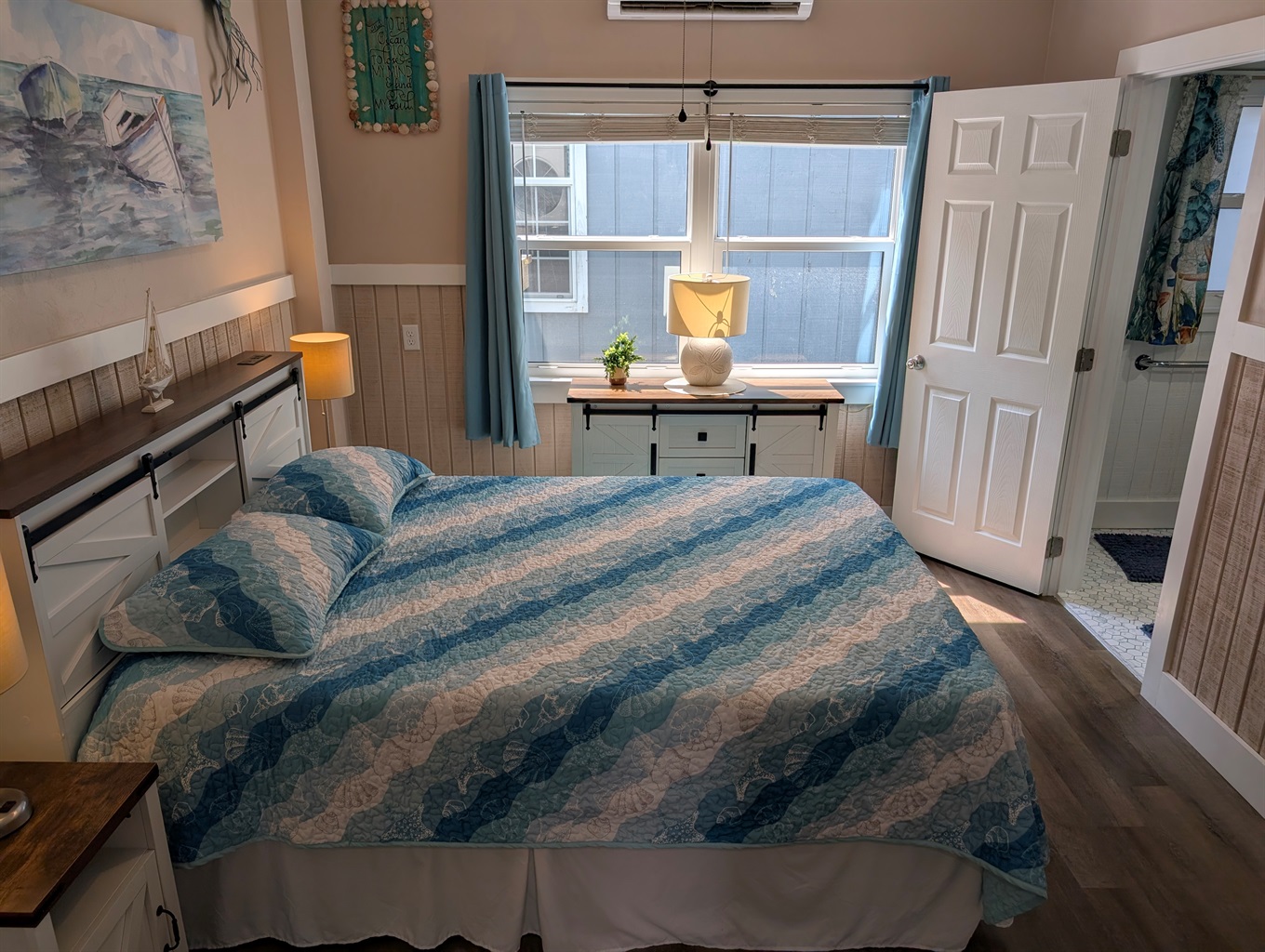 Restful Retreats: Our bedrooms continue the serene seafoam theme with premium linens and beach-inspired art.