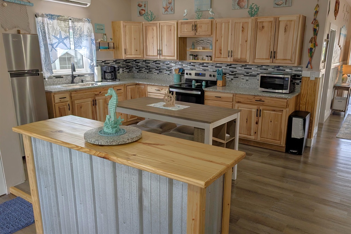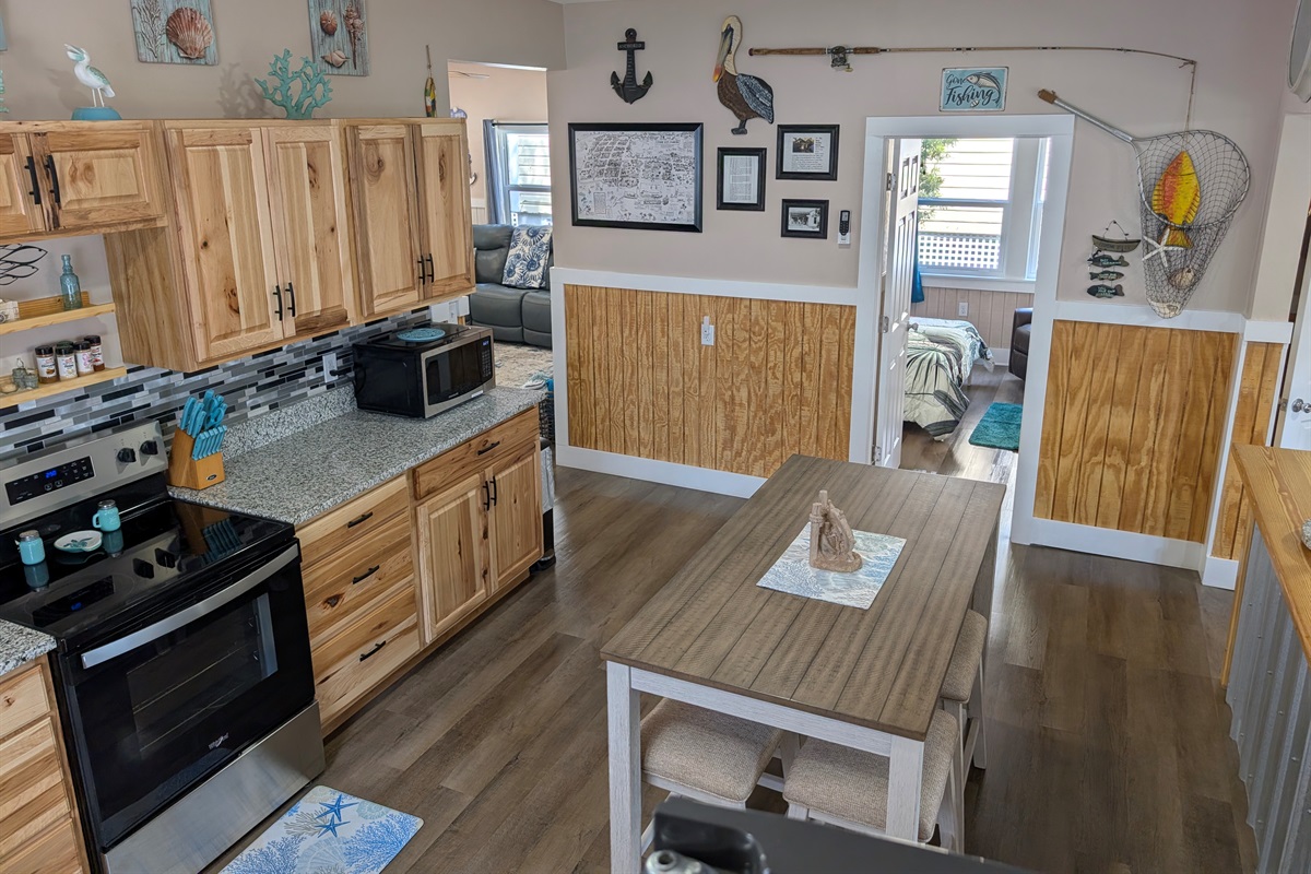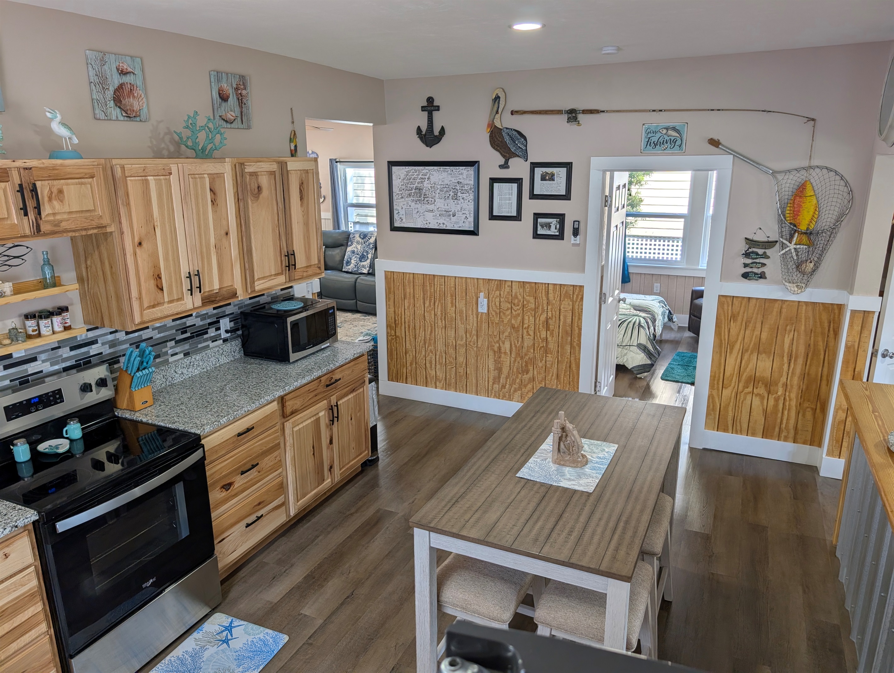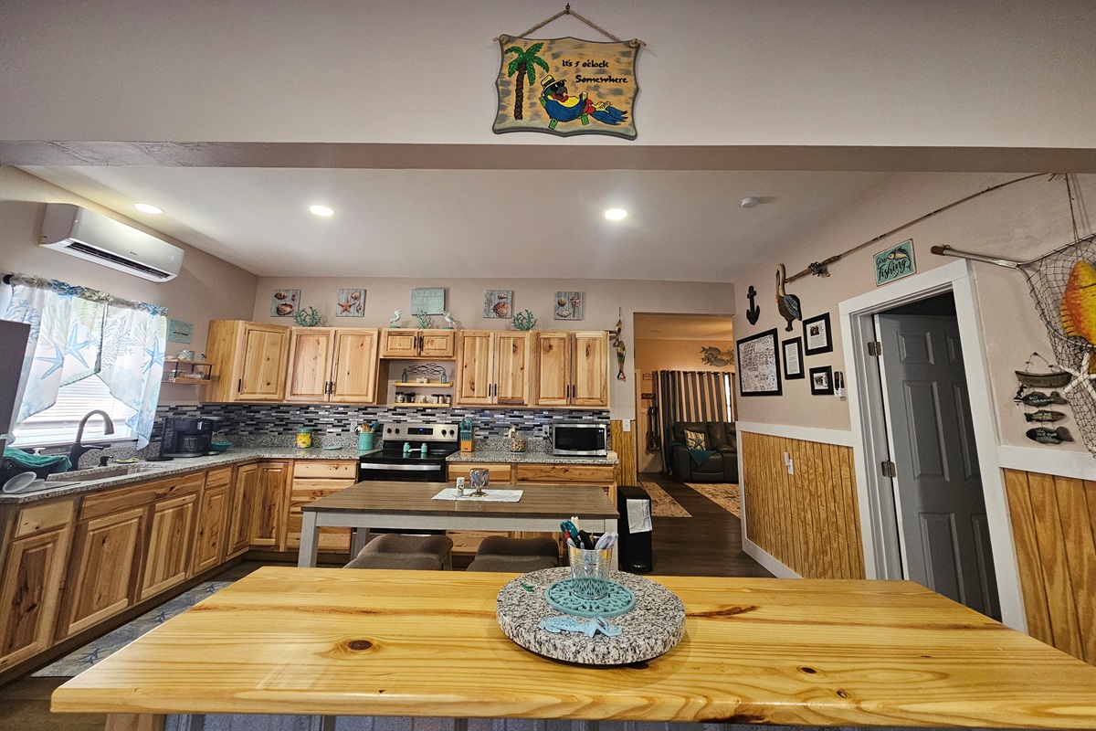 The Heart of the Home: The open-concept living area features plush leather seating and nautical accents, flowing seamlessly into a stunning chef’s kitchen. You'll find custom wood cabinetry, sleek stainless steel appliances, and a spacious breakfast bar perfect for morning coffee.