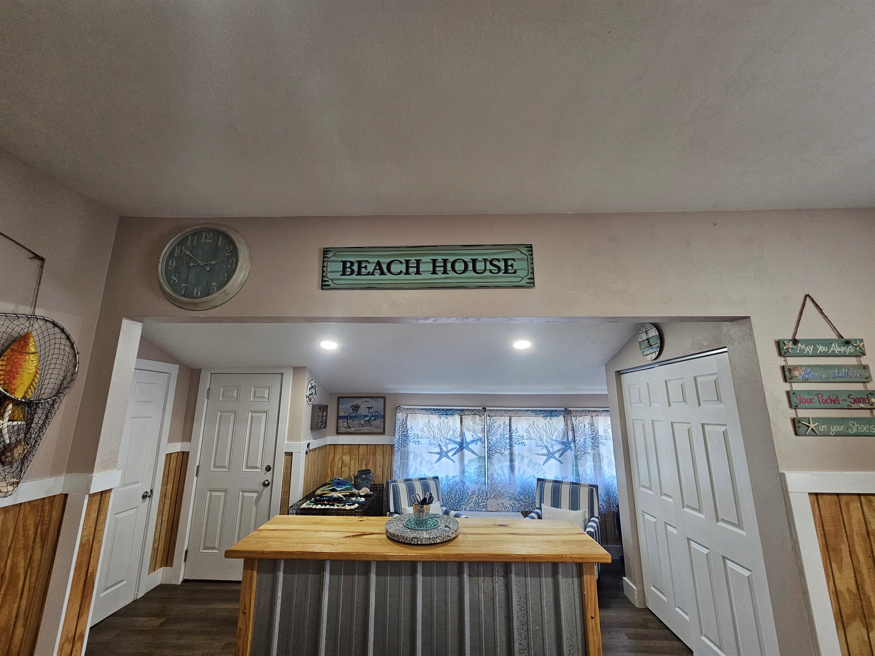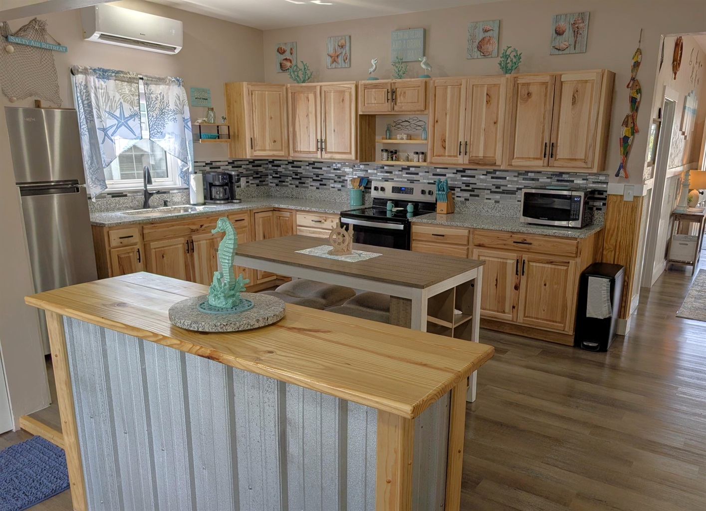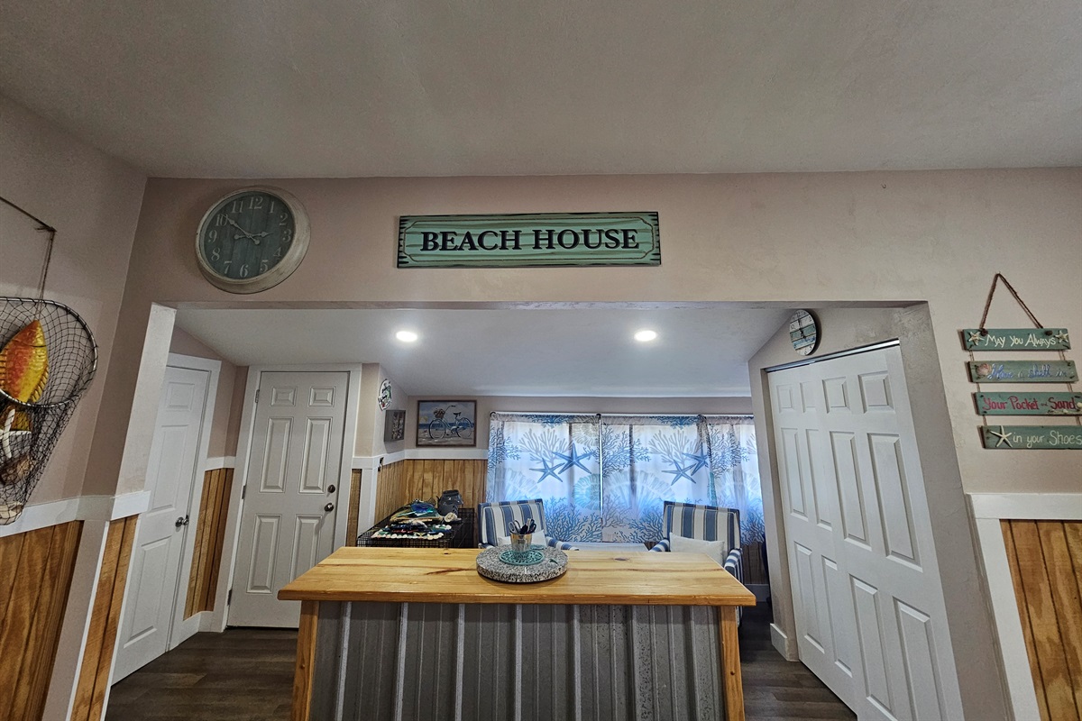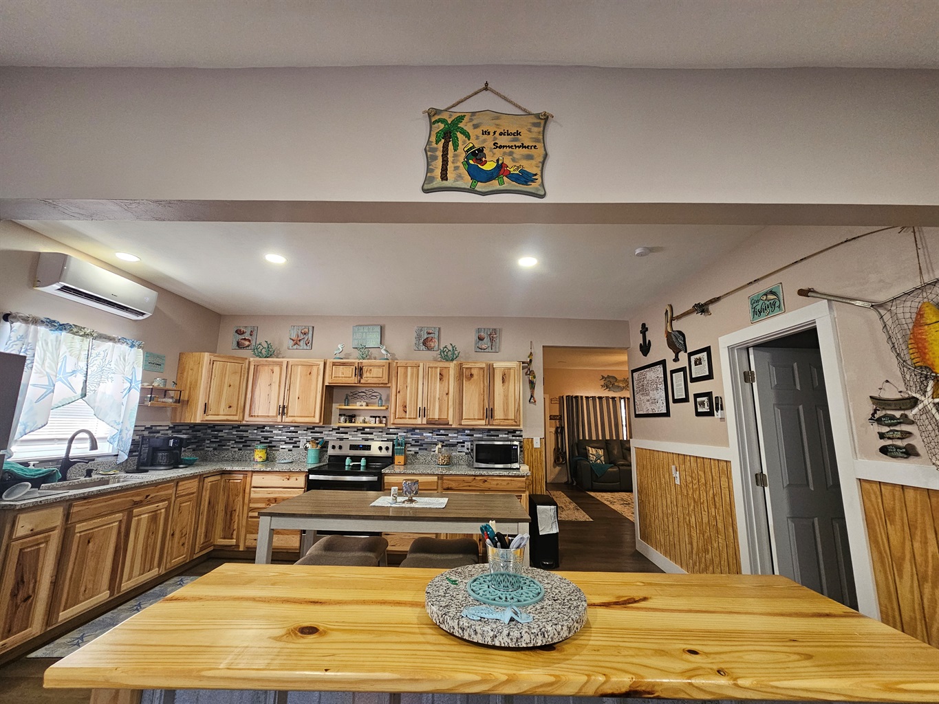 The Heart of the Home: The open-concept living area features plush leather seating and nautical accents, flowing seamlessly into a stunning chef’s kitchen. You'll find custom wood cabinetry, sleek stainless steel appliances, and a spacious breakfast bar perfect for morning coffee.